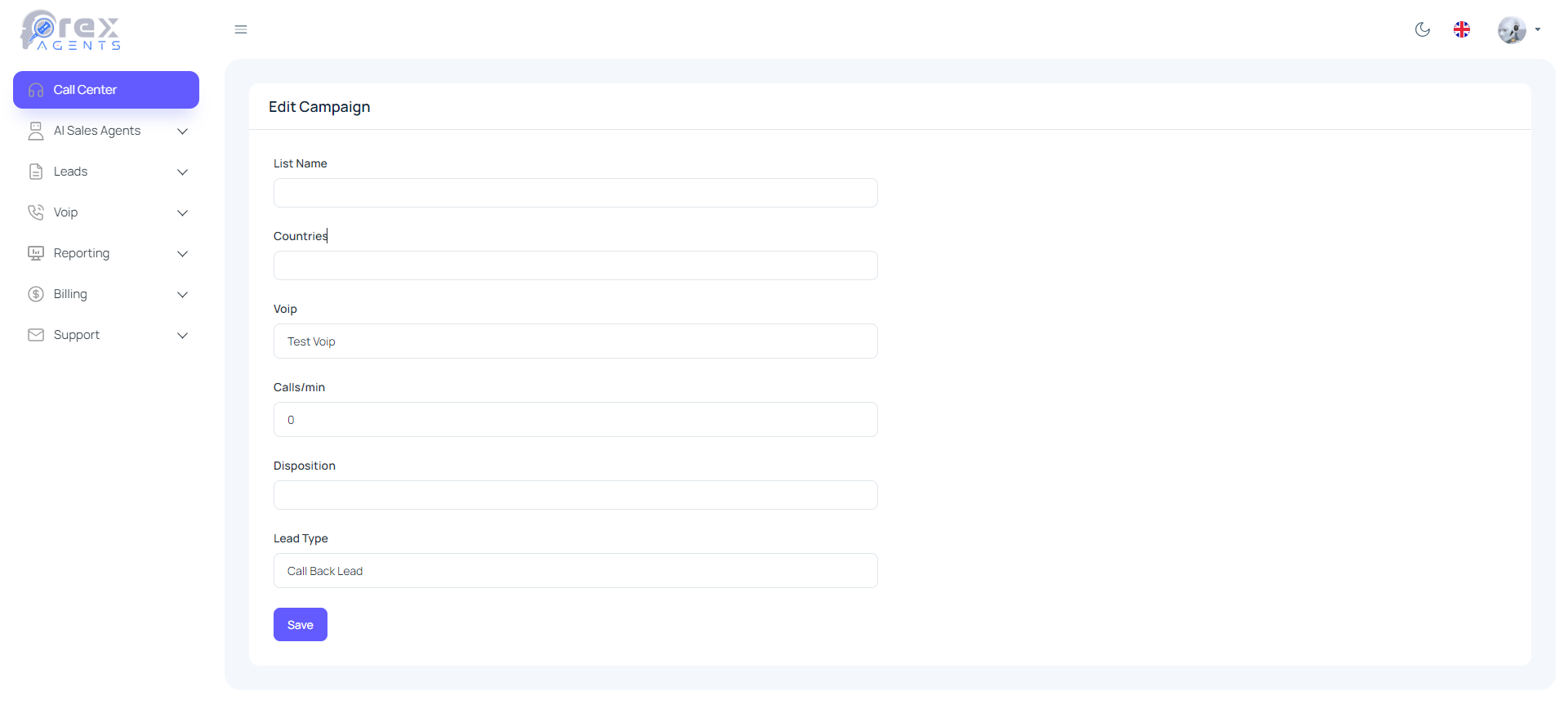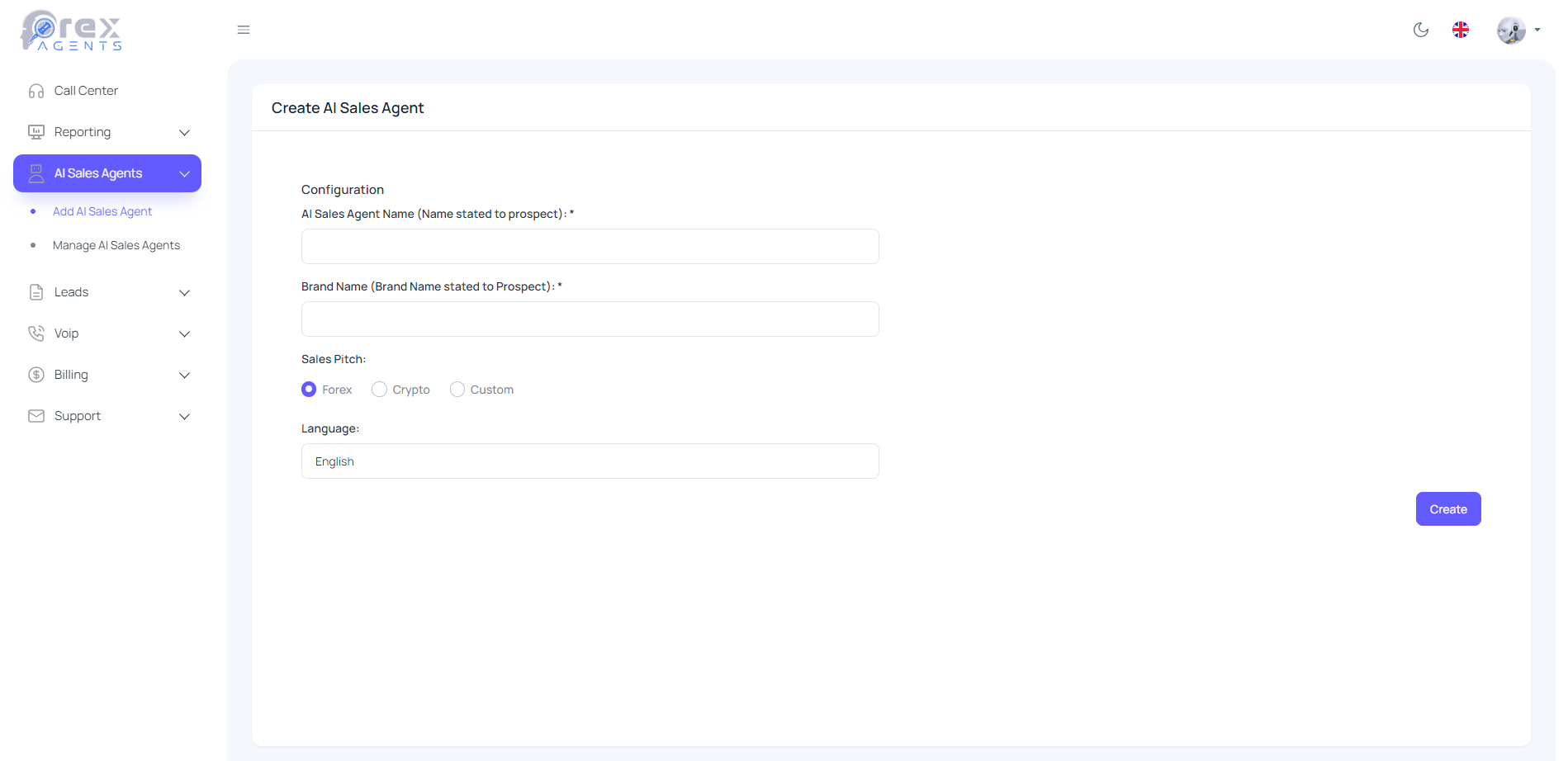 Enter your brand's name, language, and Forex or Crypto pitch the that will be used when calling to hire the perfect AI sales bot.